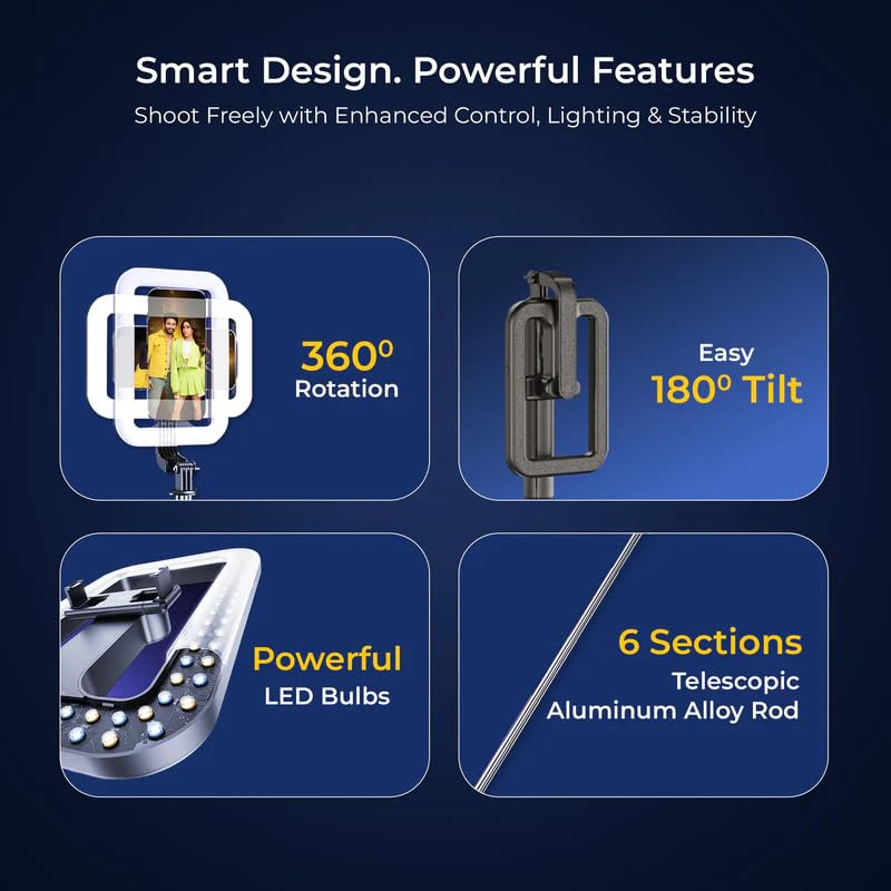 - Adjustable Height & Angles – 6-section telescopic rod extends up to 5.25 ft with 360° rotation and 180° tilt, ideal for getting the perfect frame in any setting.