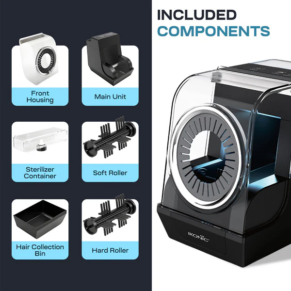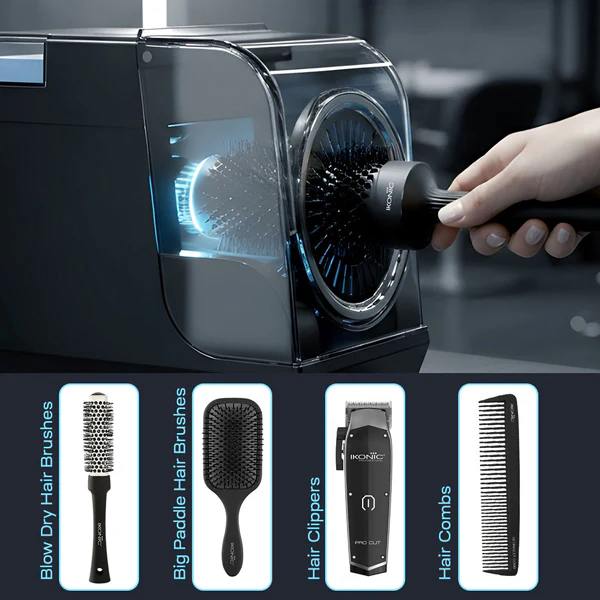Ikonic Professional 2-in-1 Brush Cleaner & Sterilizer is an automatic hair brush cleaning machine designed for effortless hygiene at home or in salons. Powered with an infrared sensor and ultrasonic mist technology, it effectively cleans and sterilizes paddle brushes, round brushes, combs, and clippers. Its sleek black design ensures quick, touch-free operation, helping maintain professional-level cleanliness and extend the life of your styling tools
