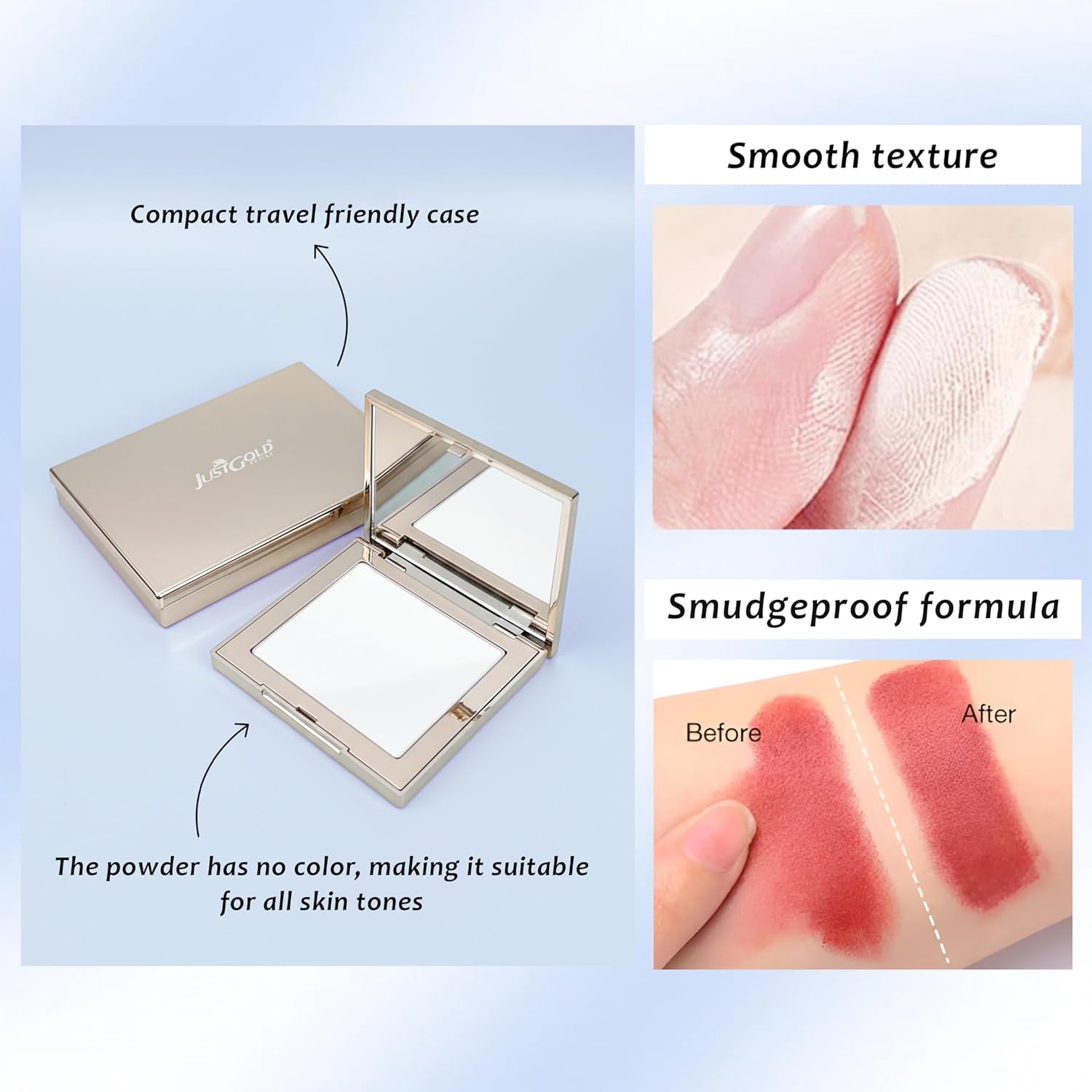 JustGold Powder Fix delivers professional-grade oil control with its ultra-fine translucent formula. The waterproof composition seamlessly blurs imperfections while mattifying skin for a flawless finish that adapts to all skin tones. Engineered to keep shine at bay throughout the day, this powder blends invisibly without settling into pores or creating a heavy appearance. Ideal for those seeking long-lasting coverage with a natural matte effect. Waterproof Sweatproof Smudge proof Transfer proof Oil Control Light Weight Pore Blurring JustGold Powder Fix- An ultra fine translucent powder which controls oil with waterproof formula that blurs, mattifies, and blends invisibly into any skin tone.