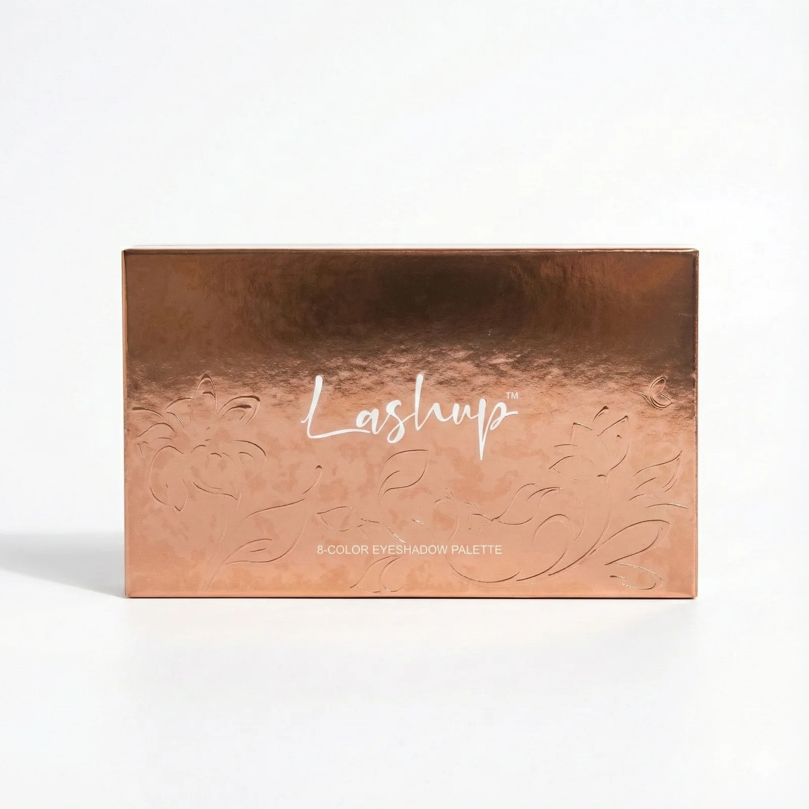 An elegant 8-shade eyeshadow palette by LASHUP featuring radiant, high-shine tones in a luxurious rose-gold compact.
