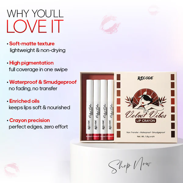 Perfect for makeup lovers and professionals alike, the Recode Velvet Vibes Set is your go-to collection for flawless, statement-ready lips anytime, anywhere.